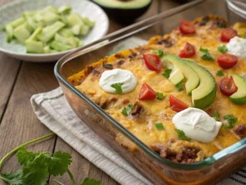 - Let the casserole cool slightly. Add desired toppings like sour cream, avocado slices, shredded lettuce, or tortilla chips before serving.